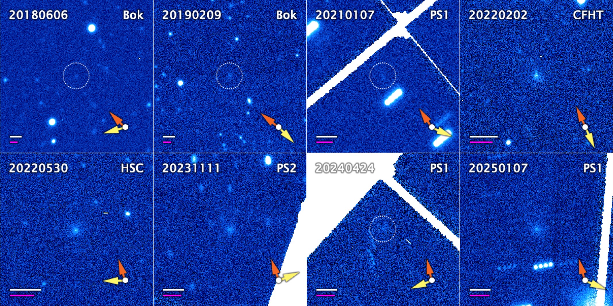 通过深入挖掘来自夏威夷和亚利桑那州天文台的历史观测资料,研究团队得以将这颗彗星的观测记录追溯到其官方发现之前,直至其距离太阳超过20个天文单位(30亿公里以上)。即使在如此遥远之距离上,这颗彗星已经开始出现活动,受太阳照射带来的能量已足以将其冻结的挥发物质(如一氧化碳)转化为气体,并带着尘埃向外喷射,从而在其周围形成了一个稀薄的大气层——我们称之为“彗发”,使得彗星呈现朦胧形态。