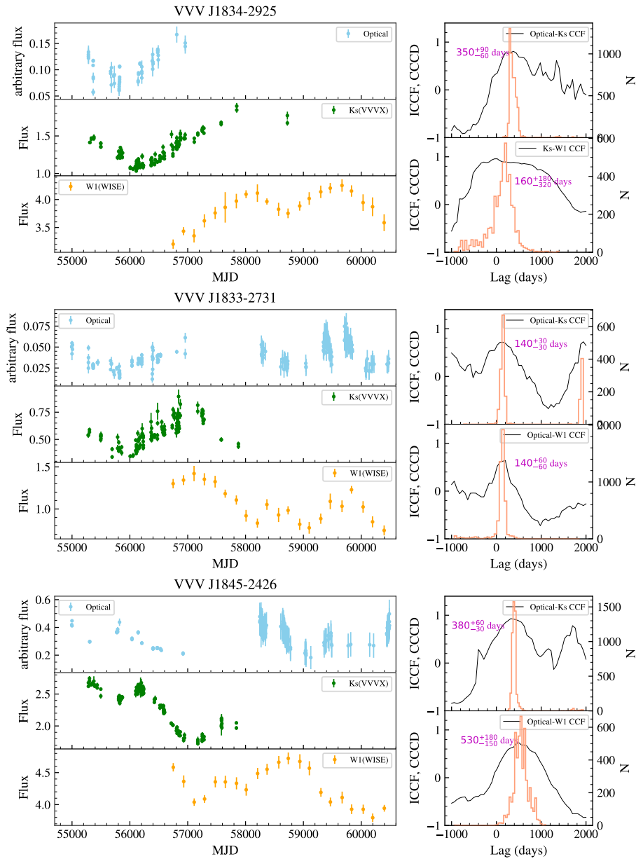 图1 目标源VVV J1834-2925(顶部)、VVV J1833-2731(中部)和VVV J1845-2426(底部)的光变曲线(左)和ICCF结果(右)。右上角的CCF分析结果分别对应于光学-近红外和近红外-中红外的相关性。所有其他CCF代表光学-近红外和光学-中红外的相关性。在右侧面板中,橙色线表示CCCD,CCF结果显示为黑色。