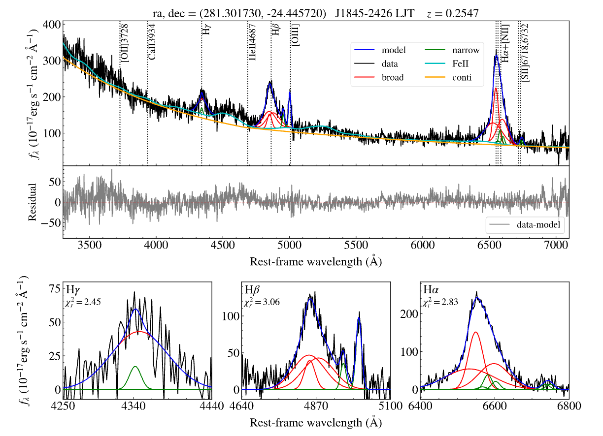 图2 VVV J1845-2426的光谱(丽江2.4m光学望远镜)拟合结果。在顶部面板中,光谱(黑线)被分解为幂律谱(橙色线)、Fe II(青色线)和发射线(蓝色线)。发射线包括宽(红线)和窄(绿线)分量。中间面板展示了光谱和拟合模型之间的残差。下面板分别展示了Hα 、Hβ 和 Hγ发射线的拟合结果。