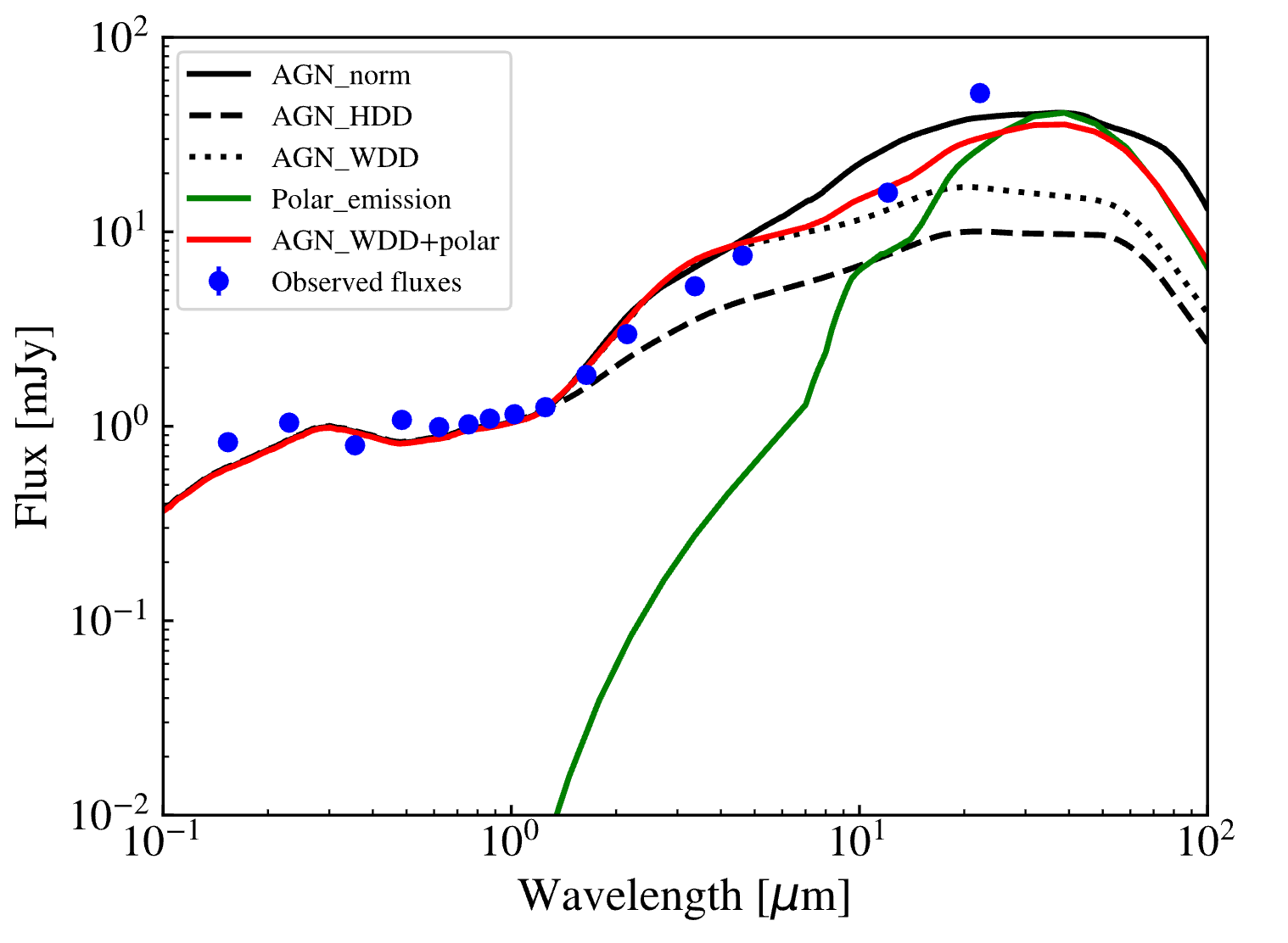 图3 使用AGN模板[4](本征模板:黑色实线,温尘埃缺乏模板[4]:黑色点线,热尘埃缺乏模板[4]:黑色虚线)和极性发射分量[5](绿色线)拟合VVV J1845-2426的结果。最佳拟合模板(红色线)是温尘埃缺乏的AGN模板和极地尘埃分量的组合。
