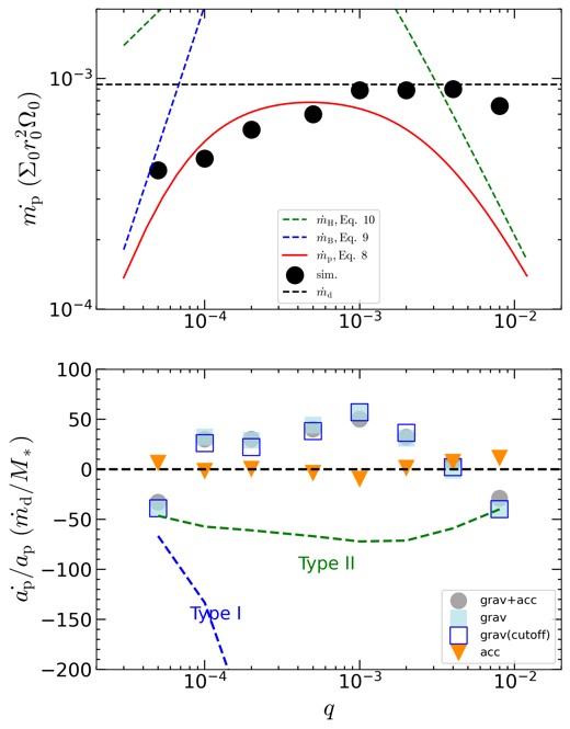 图1. 行星吸积率(上图)和迁移率(下图)随行星质量/恒星质量比q的变化。行星处在中间质量区间时,行星吸积最有效,行星迁移表现为外迁。