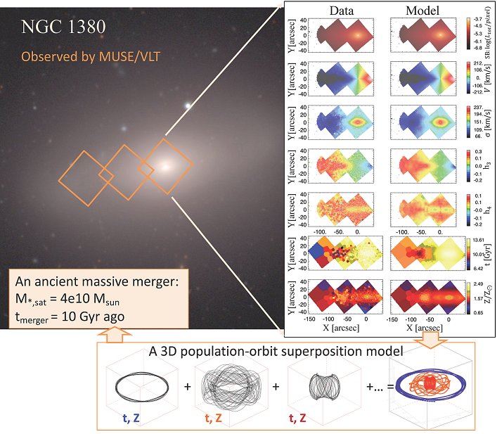 主要研究方向为通过‘化学动力学模型’研究星系的结构,暗物质质量,恒星质量分布和中央黑洞质量。恒星的轨道分布是星系形成历史的‘化石’,记录了星系形成演化所经历的动力学过程,而恒星的金属丰度表征恒星形成的宇宙年龄和化学环境。通过将动力学和化学丰度结合起来,我们深入的研究星系中的结构在‘何时’以及‘如何’形成。
