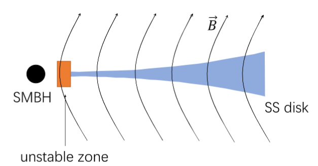 图2,模型结构示意图。由于大尺度磁场的存在,不稳定区域被限制在了靠近黑洞的狭窄范围内,即图中橙色部分。