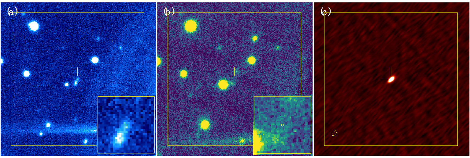 图1.从(a)到(c)十字瞄准线表示了FRB 20190520B由VLA定位给出的快速射电暴的方位。(a)图为CFHT望远镜获得的光学图像,右下方插入图显示了在FRB位置(黄色圆圈)处对应的宿主星系;(b)图为Subaru望远镜获得的红外图像;(c)图为VLA望远镜获得的射电图像,可以看到与FRB位置一致的致密持续射电源(PRS)。摘自Niu et al.2022, Nature(请详见文后的论文链接)。