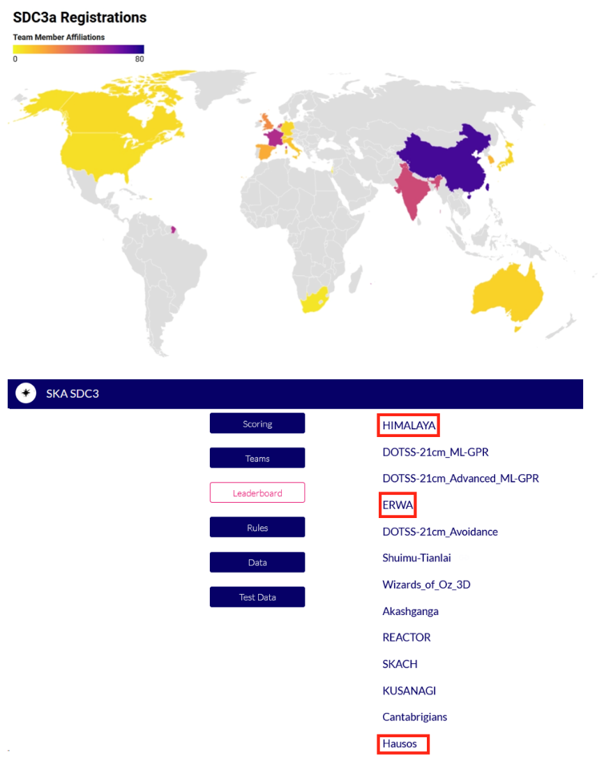 图1:SKA SDC3报名队伍分布(上图)和成绩排行榜(下图)。上海天文台SKA射电宇宙学团组牵头的参赛团队提交的3组结果位列成绩排行榜中第1(HIMALAYA)、第4(ERWA)和第13(HAUSOS)。