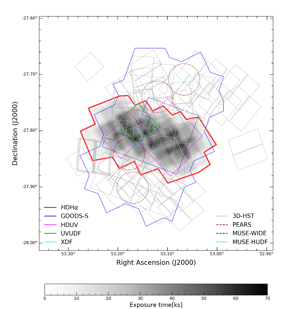 由中国科学院上海天文台的郑振亚研究员领导的研究团队对HST的大量窄带观测数据做了系统性分析,采用基于球面的同纬度等面积分层像素化算法,对HST自1999年以来四个主要成像仪器的窄带观测数据进行了全面统计。研究人员发现,在著名的GOODS南天深场中,HST利用先进巡天相机的氢-阿尔法(Hα滤光片,F658N)滤光片积累了近20万秒的窄带观测。这些观测数据收集于2009年,包含了HST的72轨的深度观测,具有极高的科学价值。然而,自这些数据发布以来,尚未有其他研究团队对其进行系统性处理。
