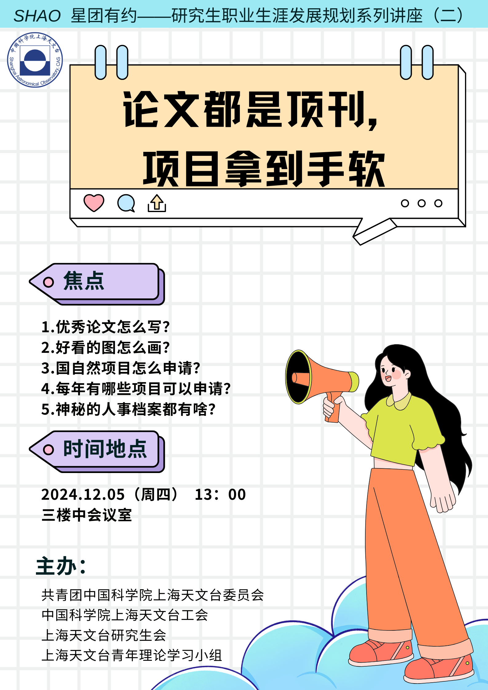 2024年12月5日,中国科学院上海天文台上海天文台团委、工会、研究生会和青年理论学习小组联合举办了备受期待的SHAO星团有约品牌活动,为台研究生、青年科研工作者们带来了第二期研究生职业生涯发展规划系列讲座。本次讲座从学术论文撰写、科研绘图、基金和项目申请、人事档案等角度出发,为研究生和青年科研工作者提供职业生涯规划指导。