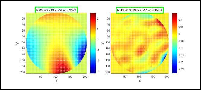 图2 微型自适应光学系统校正波前像差结果:(左)校正前,(右)校正后