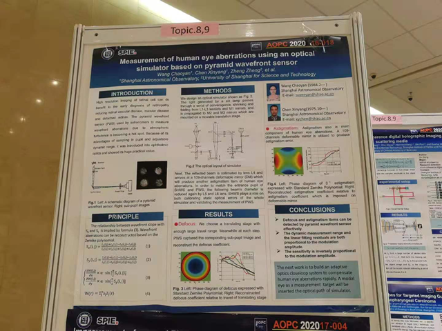 2020年11月30日至12月1日,2020世界光子大会暨第九届国际应用光学与光子学技术交流大会在北京国家会议中心召开。该会议由中国光学工程学会主办,包含多个主题研讨会。课题组王超燕、陈欣扬等人撰写的《Measurement of human eye aberration using an optical simulator based on pyramid wavefront sensor》被大会会议集Proc. SPIE 11566,AOPC 2020: Optical Spectroscopy and Imaging; and Biomedical Optics录用。陈欣扬参加了现场讨论会,并张贴海报。通过此次会议,课题组与国内同行进行了详细地学术讨论与交流。