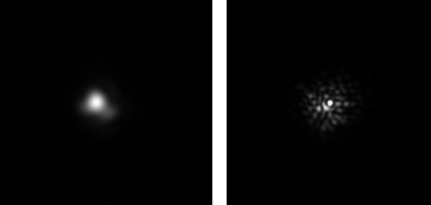 此外,针对非球面分离主镜结构形式的斐索型光干涉实验系统(图6),我们已建立起一套完整的在线光学精调方法,通过光学系统调试和实时监测,实现高精度共相检测与控制。图7是精调前后的实验系统远场像。