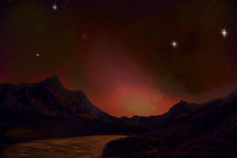 这张是Kepler-1229b和Kepler-395c行星表面刚刚日落之后的天空黄道光的艺术家想象图。Kepler-1229b和Kepler-395c分别是一个约2.7和2.3地球质量的超级地球行星。它们分别位于质量大约0.43和0.53太阳质量的红矮星的宜居带中。它们的表面可能覆盖着液体水。