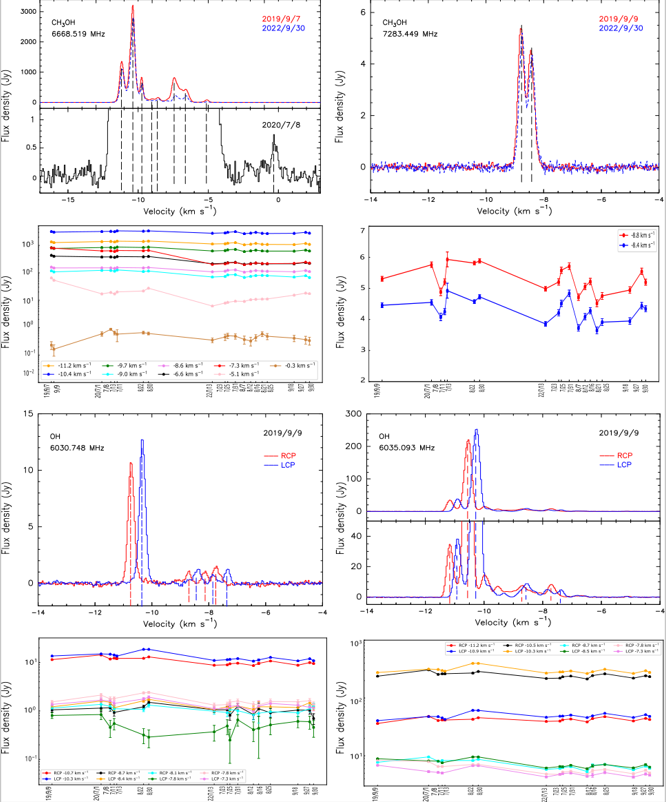 图1 甲醇以及羟基脉泽跃迁的不同速度成分的频谱和光变曲线