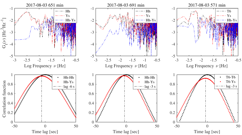 图1 9.9Rs处,不同测站获得的太阳风等离子体密度涨落的微观湍流谱及相关性