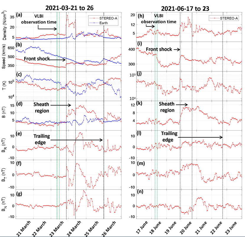 2021年,我国首次火星探测天问一号的深空探测,在保障 VLBI 测定轨任务的同时,也为行星际空间环境的探测积累了宝贵的数据。研究者通过对差分单向测距 DOR 信号的处理与分析,发现在2021年3月23与6月18日,DOR 差分相时延出现明显的下降。研究者反演了电子总含量的相对变化。经过与太阳风的就地测量数据比较,发现 DOR 差分相时延的下降是由日冕物质抛射的鞘层引起的 (He Qingbao, et al. ApJL, 2022)。
