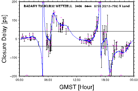 图 射电源0212+735由于其结构在三站子网BADARY-TSUKUB32-WETTZELL上依照模型得到的结构时延之和(蓝色),与由群时延观测直接得到的闭合时延(红色点)符合一致。