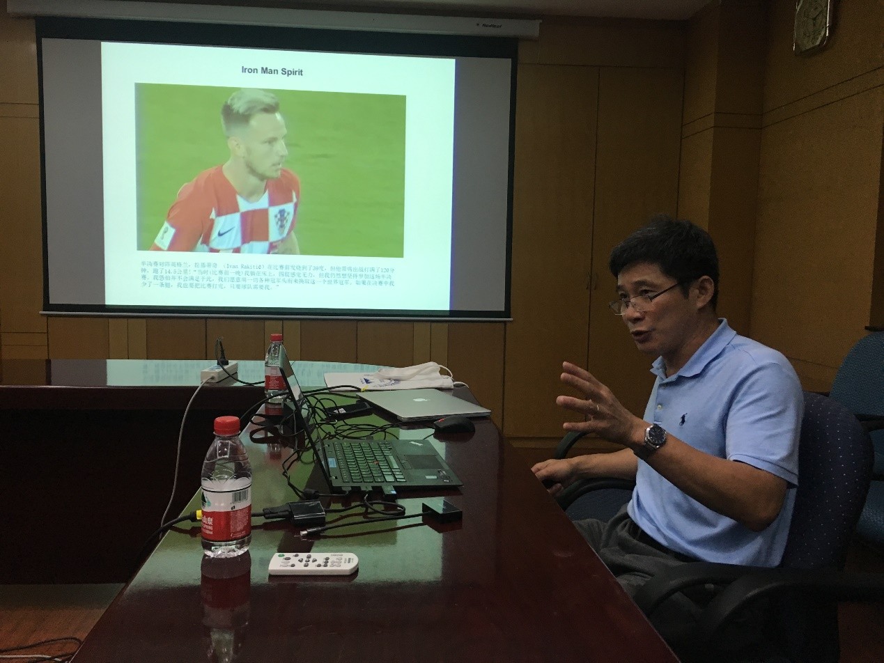 活动伊始,陈剑利教授通过一幅幅精美的图片,与大家分享了刚刚结束的在莫斯科举行的2018世界杯足球赛的盛况和令人感动的精彩瞬间。大家饶有兴致地欣赏图片,展开讨论。接着,陈老师和大家畅谈了中国足球的现状和未来。并且他从自己在美国的经历以及在瑞士,日本等国家看到的体育公共设施和青少年进行体育活动的情况分析了不同教育体制下,体育发展的问题。在场的来自足球强国巴西的访问学者Galdino也参与到了热烈的讨论中,从一个巴西人的角度给大家分享了巴西足球的历史和发展。
