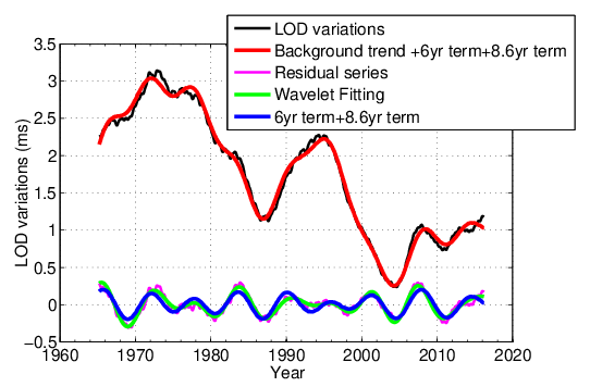 该团组研究结果表明,日长亚十年变化中实际存在两个主成分的周期信号,周期分别为6年及8.6年。这两个信号的叠加可以很好地解释观测到的日长亚十年变化的时频域特征。前人工作未能澄清日长亚十年变化的不同物理起源问题,他们的研究表明,日长变化中周期为约8.6年的信号很可能与液核表面赤道附近的扭转阿尔芬波振荡有关。