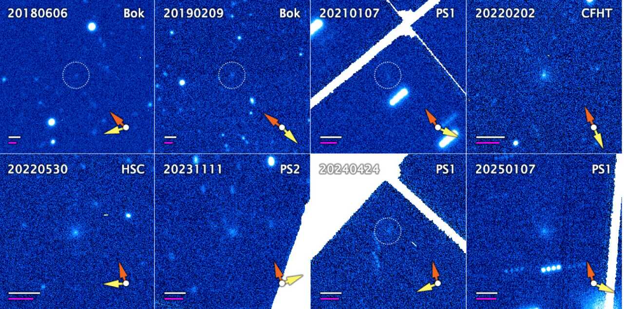 通过深入挖掘来自夏威夷和亚利桑那州天文台的历史观测资料,研究团队得以将这颗彗星的观测记录追溯到其官方发现之前,直至其距离太阳超过20个天文单位(30亿公里以上)。即使在如此遥远之距离上,这颗彗星已经开始出现活动,受太阳照射带来的能量已足以将其冻结的挥发物质(如一氧化碳)转化为气体,并带着尘埃向外喷射,从而在其周围形成了一个稀薄的大气层——我们称之为“彗发”,使得彗星呈现朦胧形态。