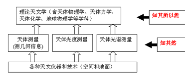 天文学是以观测及解释天体的物质状况与演化为主的学科。它可分为观测天文学和理论天文学两大基本分支。其中观测天文学是利用各种天文仪器与技术,获得天体的各类信息(‘知其然’)。理论天文学则是以数学和物理/化学的相关理论为基本工具,结合观测天文学得到的数据资料,分析解释天体的演化规律(‘知其所以然’)。天体测量主要测定天体的几何信息(包括三维的位置、三维运动速度、天体的大小与形状等参数),它与天体的光度测量、光谱测量等一起组成观测天文学,为理论天文学研究提供数据。与上游(天文仪器与技术)和下游(理论天文学研究与国防航天等应用需求领域)紧密合作,是天体测量可持续发展的前提。下图是天文学的三个层次 。