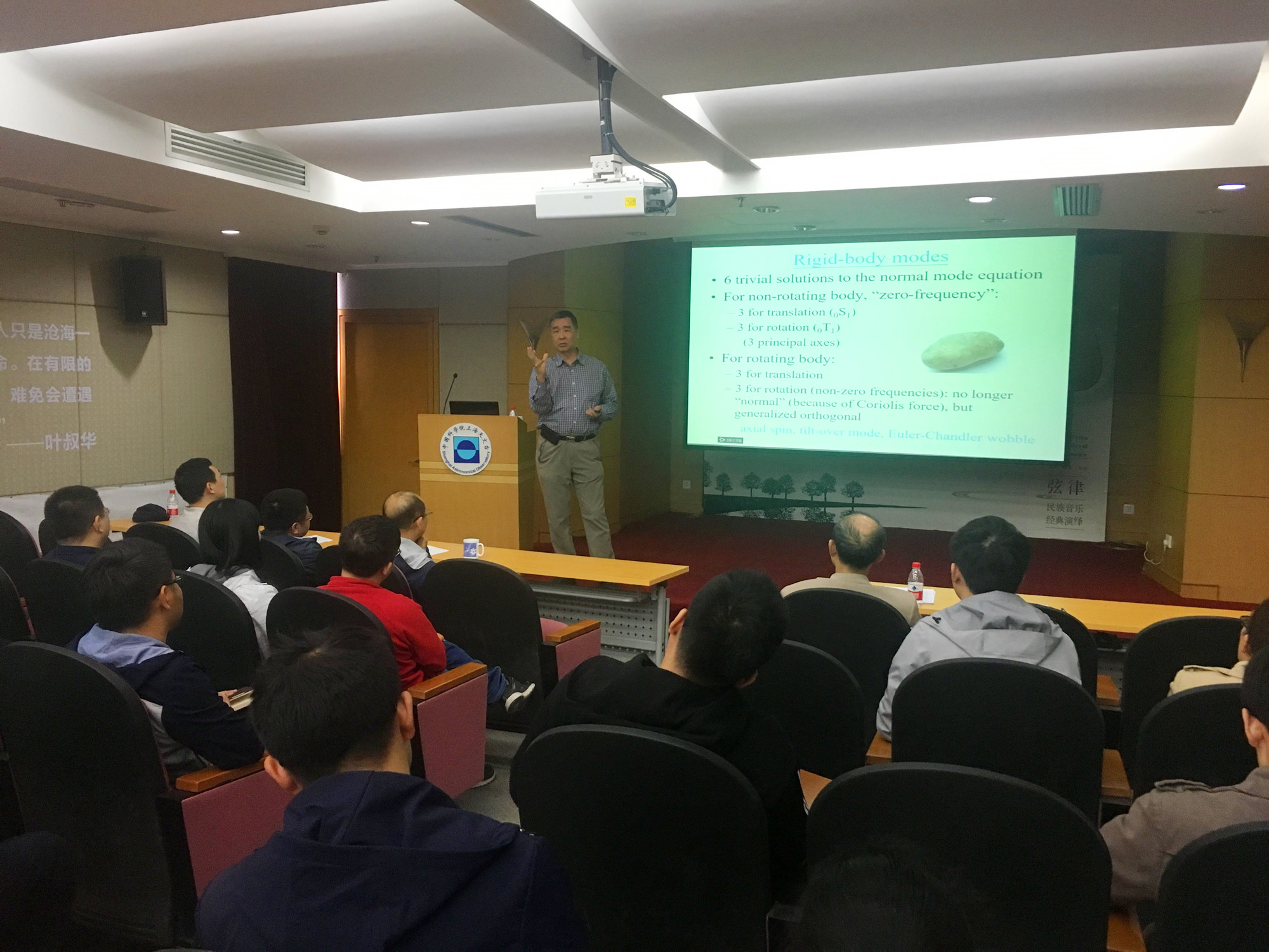 3月28日赵丰老师的报告题为Earth's normal modes of free oscillation and rotation,报告从地震本征模的基本概念出发,深入浅出地揭示了本征模的物理内涵,并深刻阐述了地球弹性本征模与地球自转本征模之间的区别与联系。为了研究本征模的激发问题,报告引出了卷积的概念,并揭示了本征模的激发与卷积的深层关系,从卷积与解卷积角度解释地球自转(章动、极移)变化的激发现象,非常简洁地解决了Chandler摆动和自由液核章动等地球自转本征模存在的随机激发问题。3月30日报告题为Some fun mathematics for geophysics and inversion,从基本的函数泰勒级数和Fourier级数展开出发,进一步延伸至利用勒让德正交级数展开地球重力场模型,再到地球重力场的反演理论。阐述了重力场反演过程需要注意的反演不唯一现象、GRACE重力卫星反演中的表层物质质量变化假设问题。