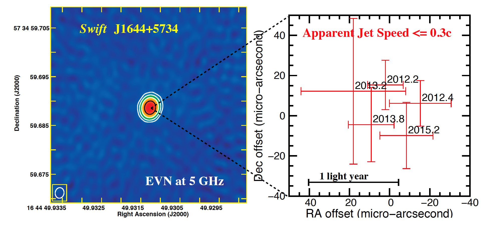 图1: 欧洲VLBI网(EVN)观测图像(左)以及顶级精度的相对位置测量(右)。右图表明Swift J1644+57的喷流无明显的横向运动,速度上限为0.3倍光速。