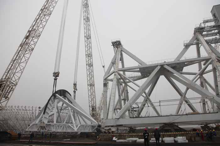 3月17日早晨,工地现场笼罩在一片薄薄晨雾中。早上6点,技术人员和工人就开始了俯仰机构吊装的准备。根据风速仪测得的短时风速均在每秒2米以内,具备吊装方案所规定的气象条件,6点40分随着现场吊装总指挥一声哨响,俯仰机构起吊开始。两台履带吊车吊钩的缓慢升起,庞大的俯仰机构被抬离地面,徐徐升到高空,上午10点时到达了距地面36米高的安装轴承座上空,随后俯仰机构两侧相距29米的两个轴承精准地‘降落’在座架的两个轴承座上,盖上轴承盖,俯仰机构被稳稳地安装在天线座架上,按照预先受力分析设计,俯仰机构保持倾斜15°,地锚承载38吨的稳定状态,确保卸钩施工安全。