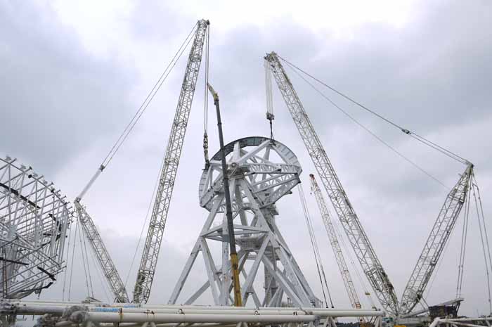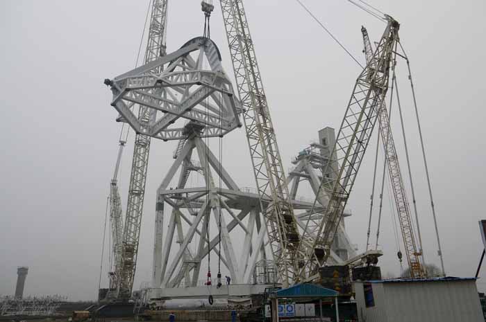 上午10点进场,在地锚平衡受力状态下、进行换钩、拆索、800吨吊摘钩等一系列工序,转为一台1000吨吊车单吊,释放地锚,下午5点30分俯仰机构开始翻转作业,1000吨单台吊车利用俯仰机构自身重力,整个俯仰机构绕俯仰轴向下缓慢转动。下午6点实现了180°的安全翻转,翻转过程持续30分钟。