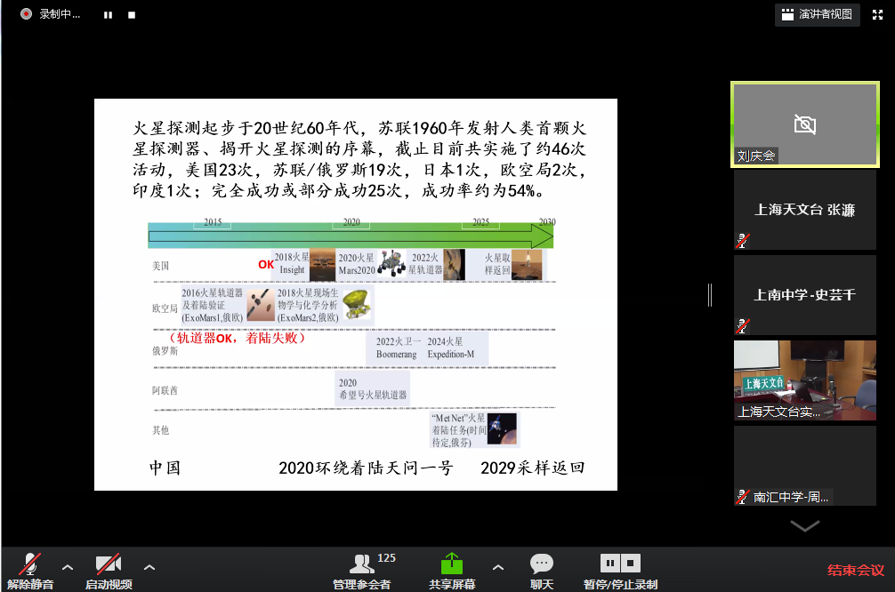 7月23日我国成功发射“天问一号”火星探测器,工作站邀请到了上海天文台正高级工程师刘庆会老师为工作站学生带来了火星探测和天问一号课程,介绍了火星概况和历年火星探测,也讲述了我国天问一号的概况,带领学生进一步地熟悉火星探测。