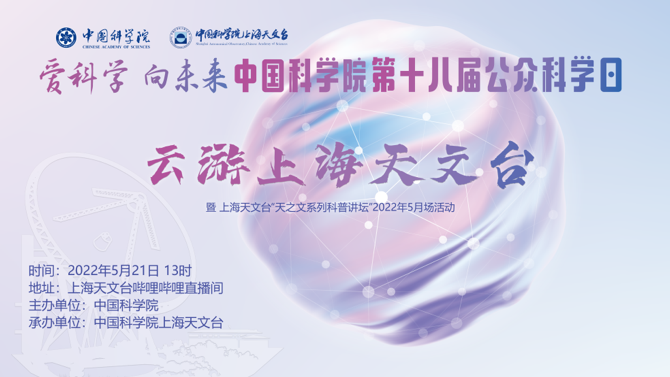 5月21日,中国科学院上海天文台举办中国科学院第十八届公众科学日暨上海天文台“天之文”五月场活动,主题为“爱科学,向未来”。受疫情影响,上海天文台采用了线上直播形式,展示我台近年来的部分重大科技创新成果。本次活动通过上海天文台B站直播、中国金融信息中心微信视频号和“上海科技”等平台,吸引了万余名热爱科学的社会公众观看直播。