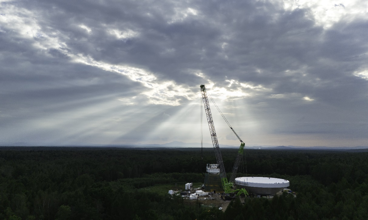 赵漳作品《天际之光》:图片展示了探月四期长白山40米口径射电望远镜的建设现场正在进行天线反射体吊装前的准备工作。巨大的起重设备矗立在广袤的山林间,夕阳透过云层洒下的光线为现场增添了神秘与庄严的氛围。这是中国探月工程的又一重要进展。