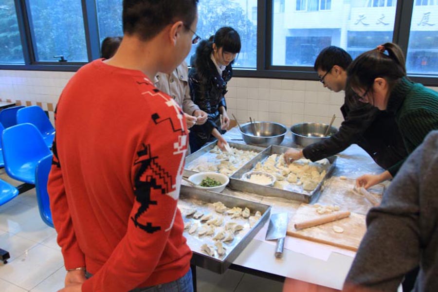 在完成了前期准备之后,就开始了包饺子的速度大赛。所有参加比赛的同学被分成了四组,在规定时间内人均包的饺子最多的小组就是获胜组;宣布了比赛规则之后,同学们都卯足了劲开工了。最后,A组的姜楠、甘江英等人在十分钟之内完成了近3大盘的饺子,数量超过了200个,以绝对领先的优势摘得了包饺子速度奖。但是大家的真正热情并不都在于比赛,而是在于包饺子本身,完成速度比赛之后,大家依然兴致浓厚,将包饺子活动进行到底。期间有的同学还充分发挥想象力和动手能力,包出了各种充满趣味的饺子。还有的同学在饺子内放入杏仁,包成幸运饺子,吃到的同学在新的一年里一定会好运连连。最后,大家评出了最美观的饺子。谢艳霞同学凭借她精湛的手艺,获得了这一殊荣。