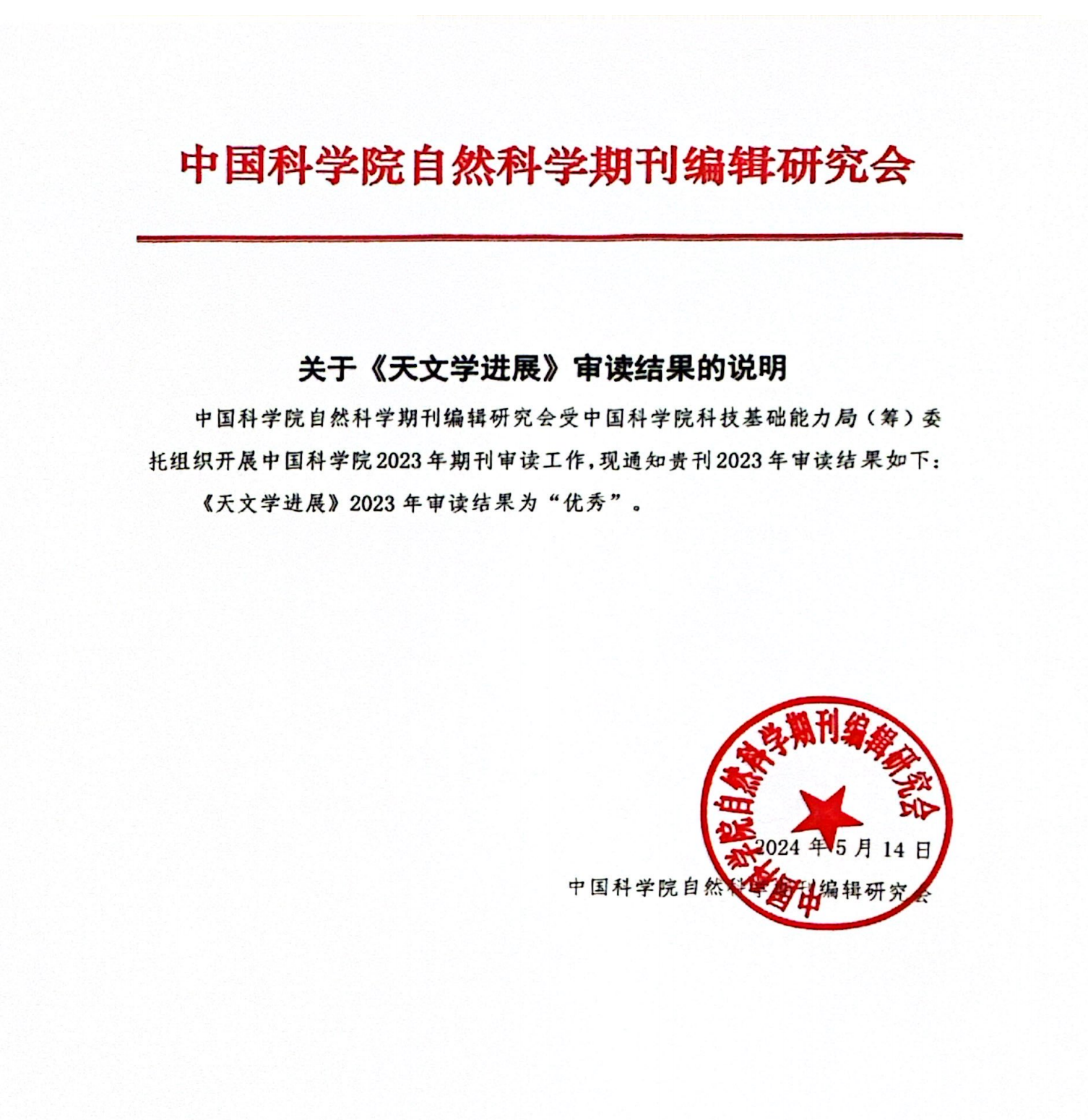 《天文学进展》在中国科学院2023年期刊审读中获得优秀奖