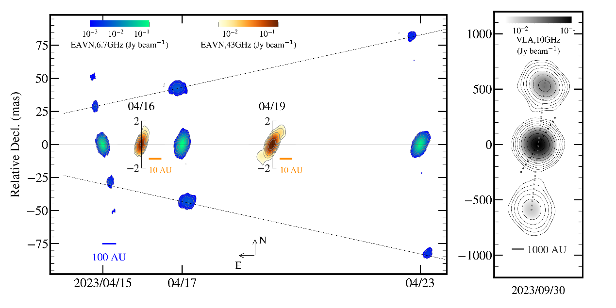 微类星体是由一颗恒星级黑洞或中子星与一颗普通恒星组成的双星系统。GRS 1915+105是其中著名的黑洞微类星体,自1992年发现以来,其喷流方向长期稳定在方位角147°附近。2023年4月,在该天体的射电爆发期间,研究人员利用东亚VLBI网在6.7 GHz图像中分辨出双向离散喷流,同时在43 GHz图像中探测到中心连续喷流。结果显示,连续喷流仍与长期方向(约147°)吻合,而离散喷流却出现在约188°的方位上,偏离连续喷流方向40°多。在2023年9月下旬的又一次爆发中,同样观测到了类似的方位角偏离。