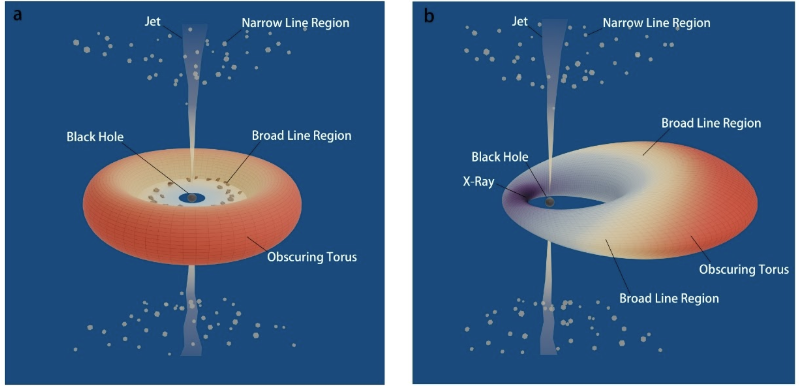 图1. a经典的活动星系核模型,b基于椭圆吸积盘理论的统一AGN模型