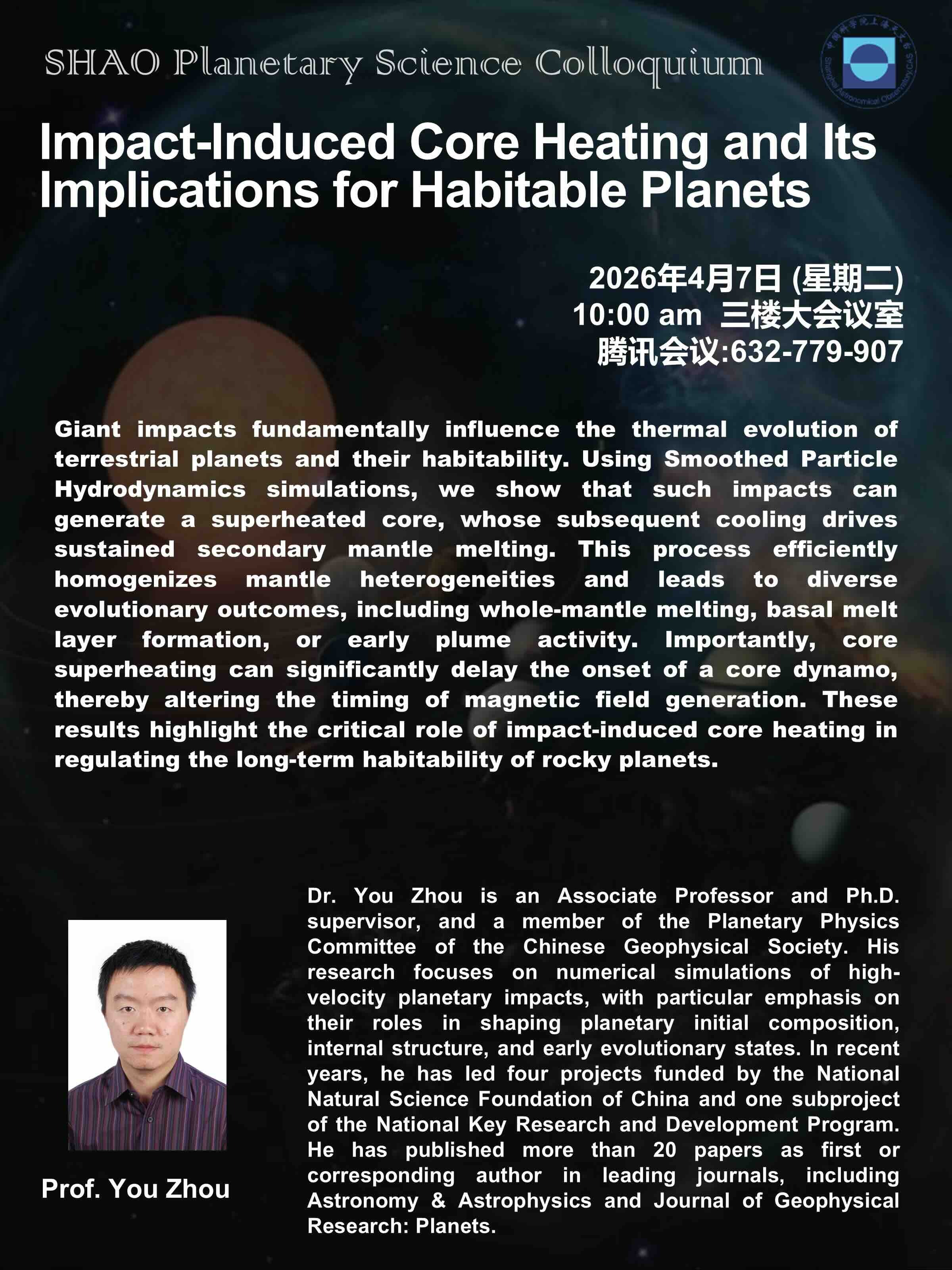 About the SpeakerDr. You Zhou is an Associate Professor and Ph.D. supervisor, and a member of the Planetary Physics Committee of the Chinese Geophysical Society. His research focuses on numerical simulations of high-velocity planetary impacts, with particular emphasis on their roles in shaping planetary initial composition, internal structure, and early evolutionary states. In recent years, he has led four projects funded by the National Natural Science Foundation of China and one subproject of the National Key Research and Development Program. He has published more than 20 papers as first or corresponding author in leading journals, including Astronomy & Astrophysics and Journal of Geophysical Research: Planets.