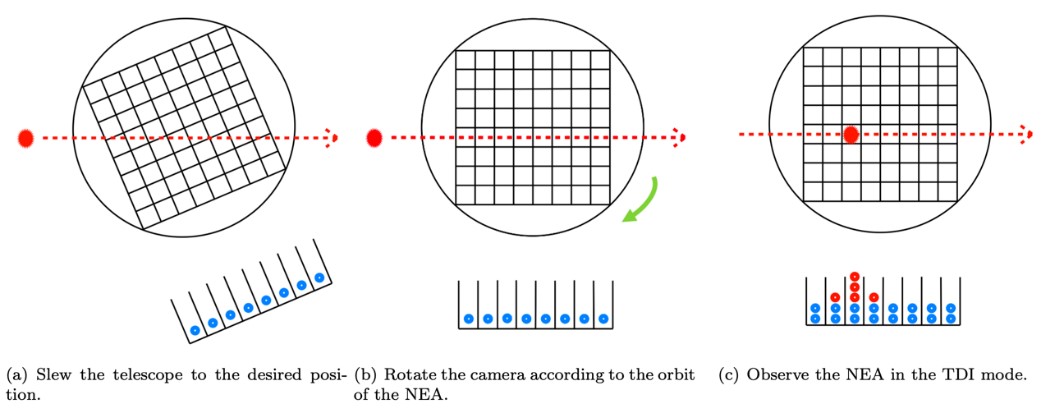 (左图:将望远镜指向小行星预报出现位置。中图:旋转相机,使得相机方向与小行星运动方向相一致。右图:利用漂移扫描方式观测小行星)