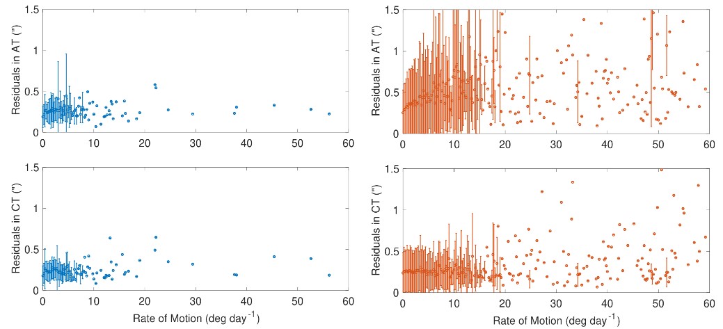 图2,观测残差均方根的均值及标准偏差,随小行星视速度在沿迹(上图)和垂迹方向(下图)的变化(左图:旋转漂移扫描CCD观测数据。右图:其他望远镜的跟随观测数据)